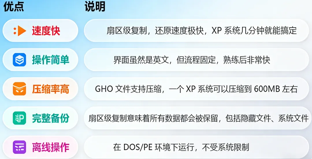 为什么 Ghost 还原比正常安装快这么多? 因为正常安装系统走的是"安装流程"——解压文件、检测硬件、安装驱动、配置系统、创建用户,每一步都要消耗时间。而 Ghost 还原是扇区级复制,相当于直接把一个已经装好的系统"倒"回硬盘,跳过了所有安装步骤,本质上只是一次数据写入操作,所以速度远快于正常安装。在机械硬盘时代,正常安装 Windows XP 可能要 30-60 分钟,Ghost 还原只需要 5-10 分钟,这个差距让它成了电脑城批量装机的首选方案。