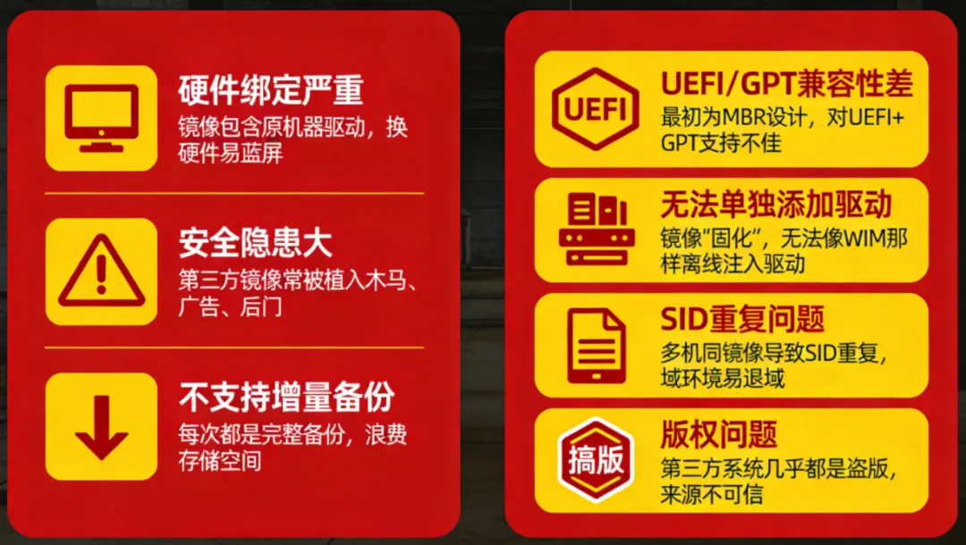 •第三方 Ghost 镜像普遍捆绑广告、后门,企业域环境还会因 SID 重复导致退域。