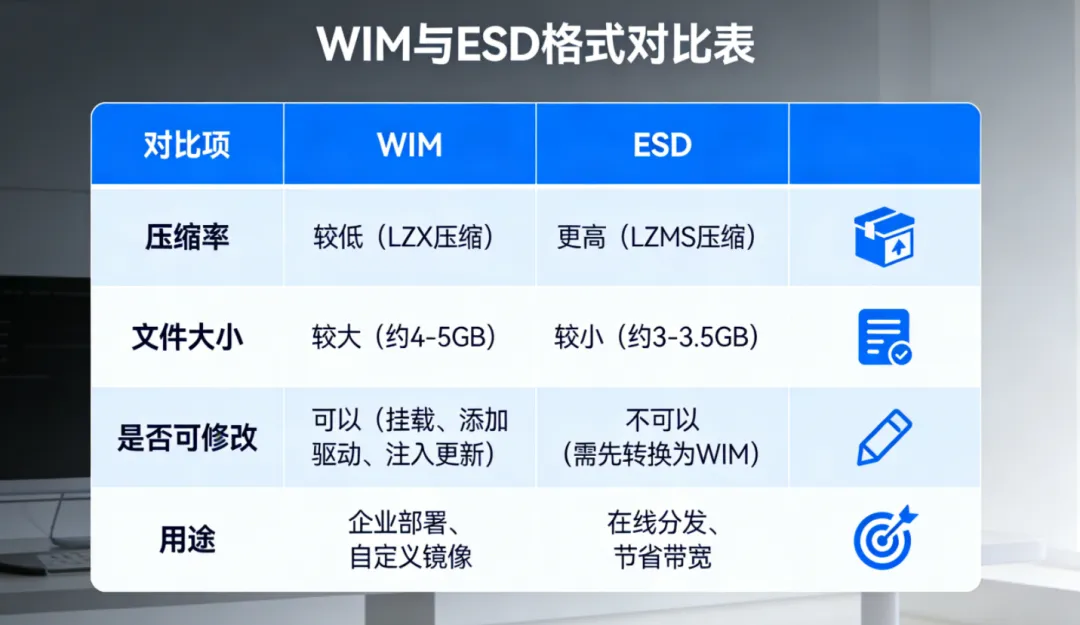 ISO 是一个光盘镜像容器,里面包含了 Windows 安装程序和系统镜像文件。你从微软官网下载的.iso文件,解压后在sources文件夹里就能找到 install.wim 或install.esd。WIM 和 ESD 本质上是同一种东西,只是压缩方式不同: