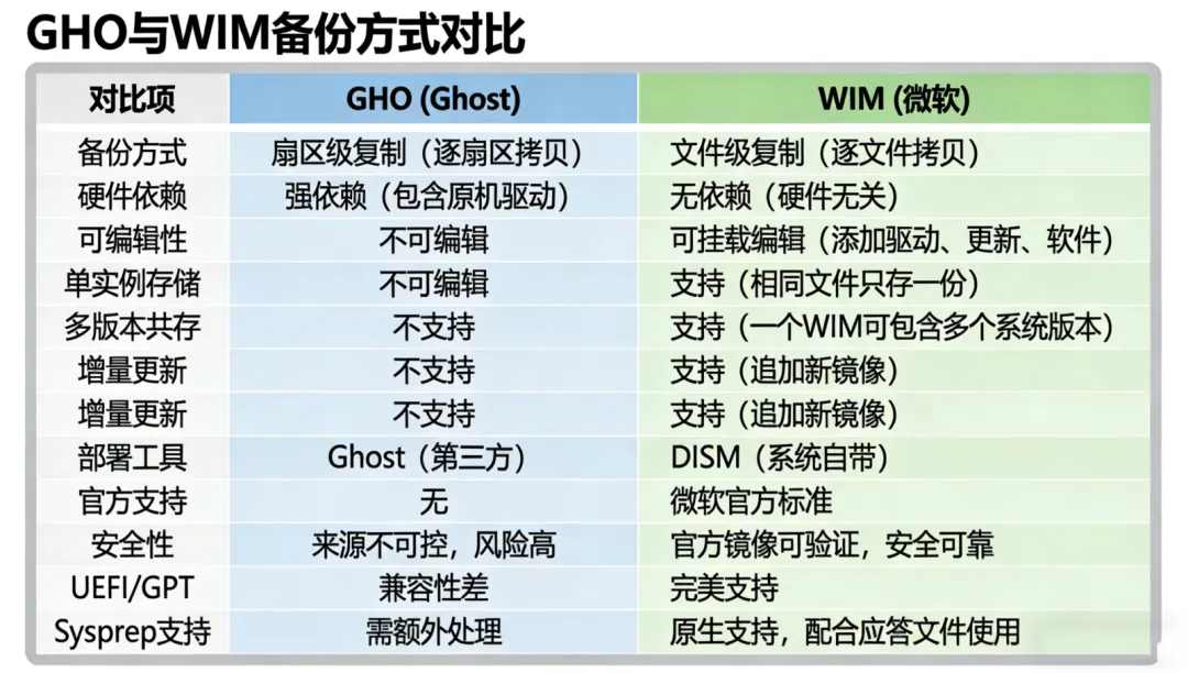 •微软官方 WIM/ESD 镜像可验签、可定制,安全性和合规性远胜 Ghost。