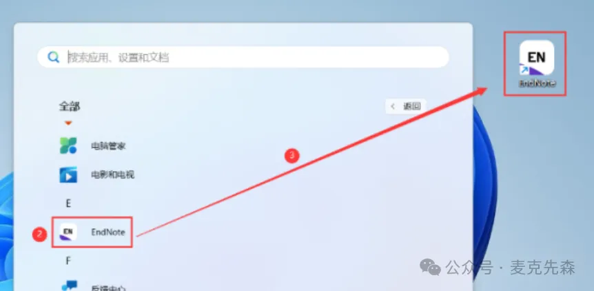 12,回到桌面,点击任务栏的【开始菜单】,在【所有应用】中找到【EndNote软件图标】,将软件图标拖到桌面上,完成软件桌面快捷方式的创建。