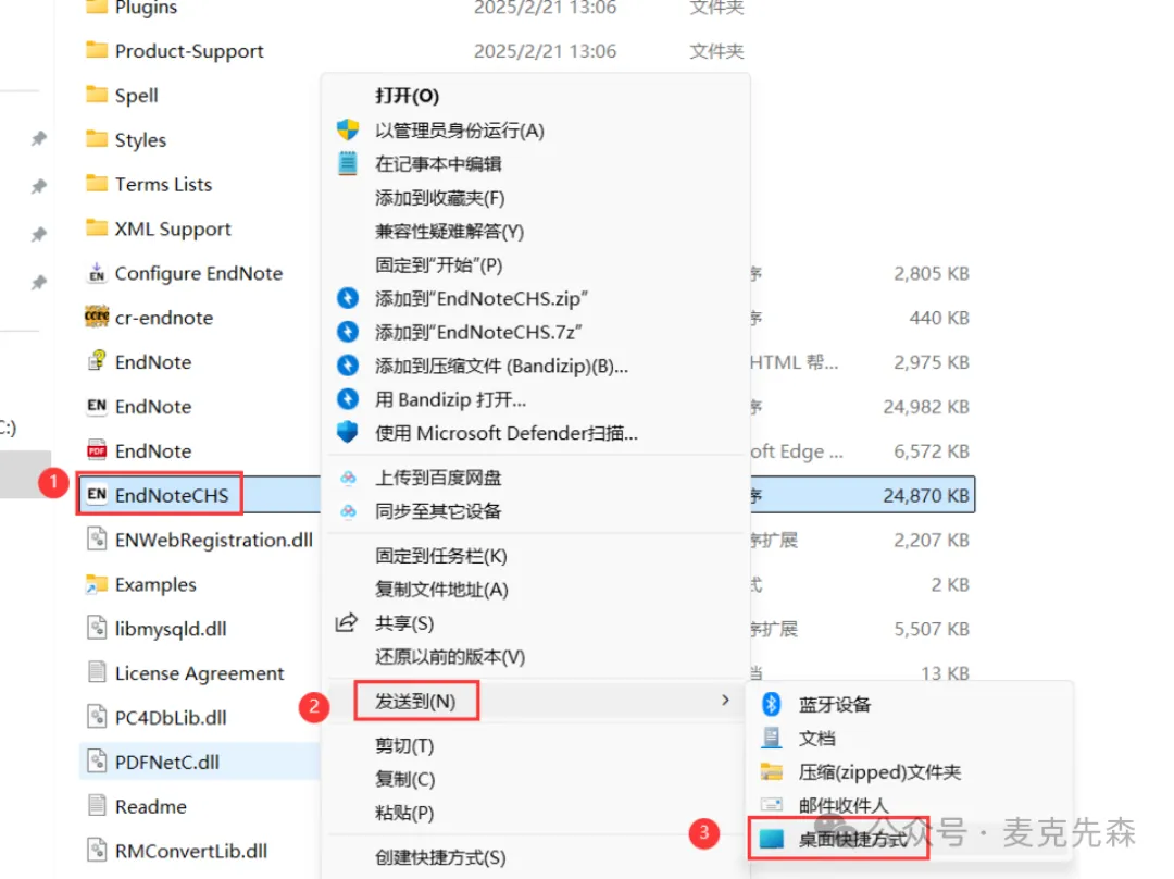 16,找到粘贴的【EndNoteCHS】文件,右键依次点击【显示更多选项】、【发送到】、【桌面快捷方式】,完成软件桌面快捷方式的创建。