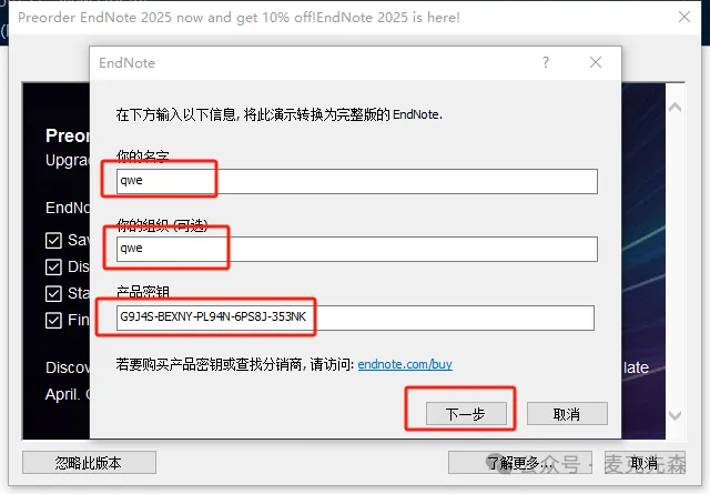 24,回到刚刚没有关闭的界面,【你的名字】和【你的组织】随便填写,要求是英文,然后将复制 密钥粘贴到【产品密钥】,然后点击【下一步】。