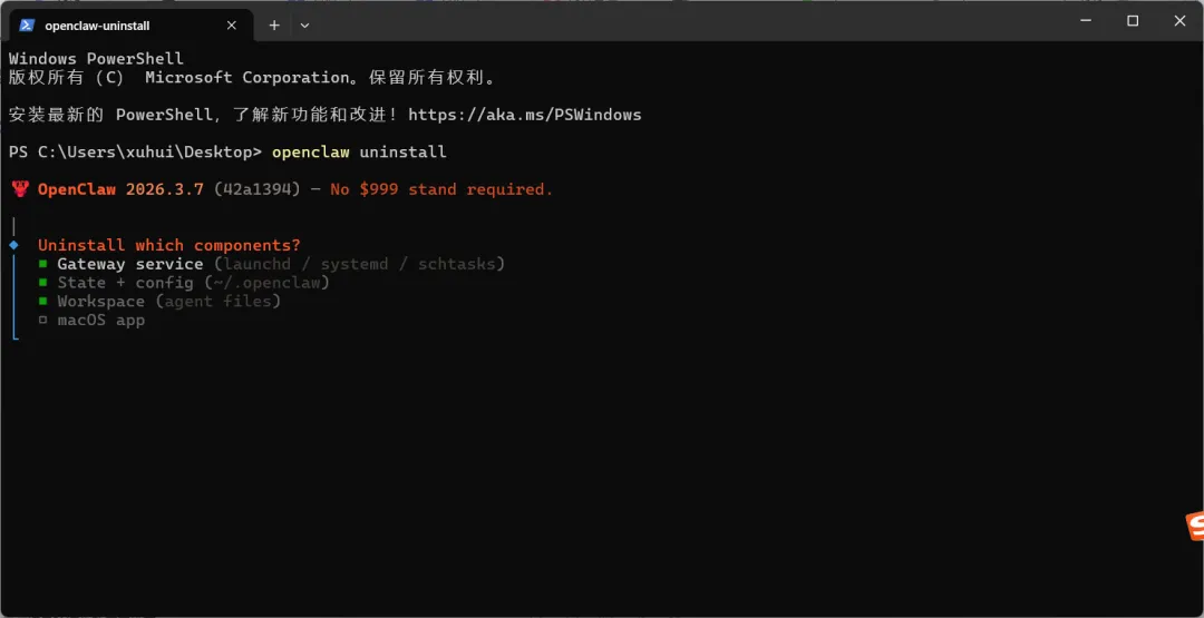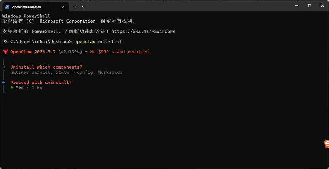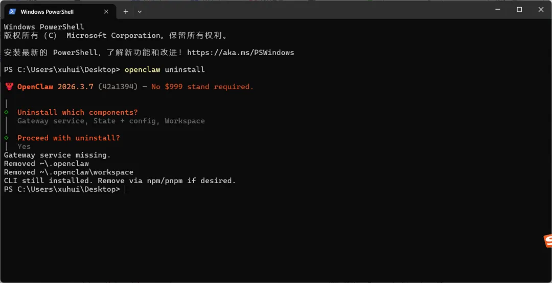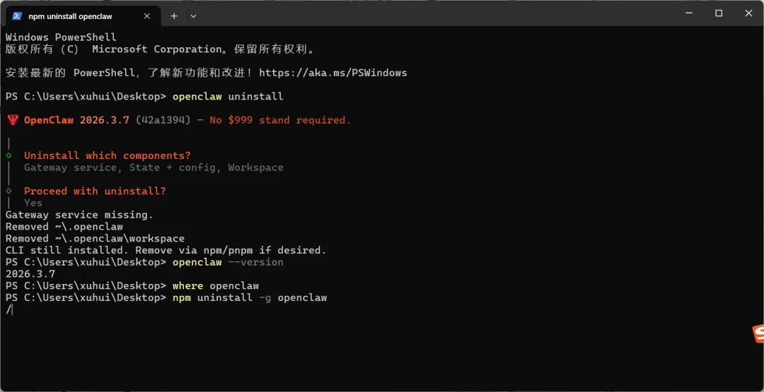 如果还显示版本号(如 2026.3.7),说明命令行工具还在,需要继续下一步。