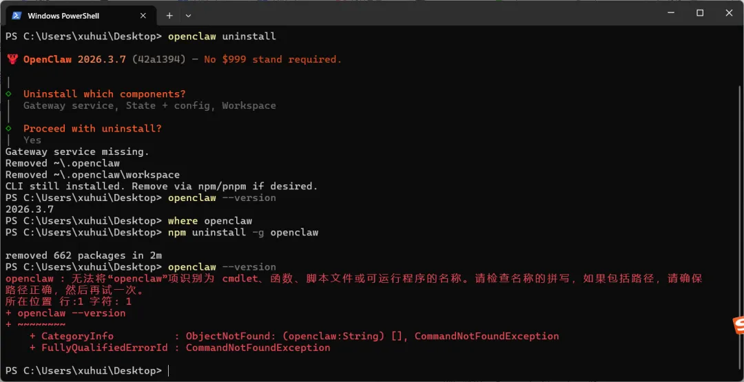 如果提示 **'openclaw' 不是内部或外部命令**,说明彻底卸载成功!✅