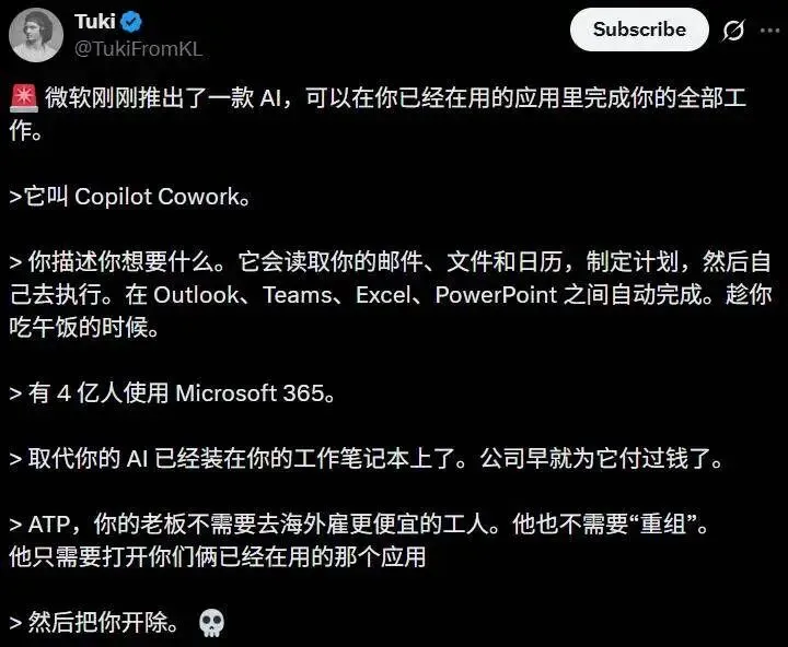 2024年春天,微软悄悄给全球4.5亿Office用户推送了一个更新,没人点安装按钮,系统自己就完成了升级,这个叫Copilot Cowork的功能,第一次让AI不只是回答问题,而是直接动手干活,你只要说一句把下周会议材料准备好,它就能翻查邮件、查找文档、制作PPT、发送提醒,连你睡觉时都在后台运行流程,我试过一次,早上醒来发现昨天要交的报告已经生成完毕,还附上三个版本供我挑选,它甚至记得我上次说过别用太多图表。