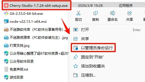 2.打开刚刚解压的文件夹,鼠标右键点击“Cherry-Studio-1.7.24-x64-setup.exe”选择“以管理员身份运行”