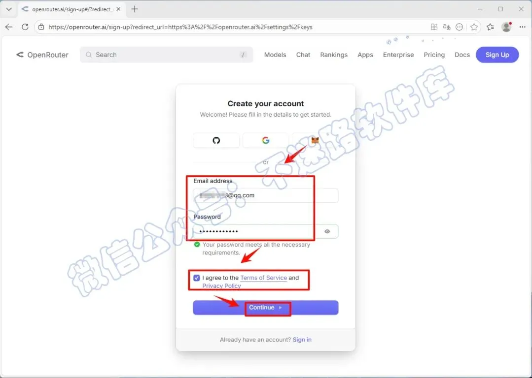 11.输入邮箱和密码注册账户,勾选”I agree“,点击”Continue“