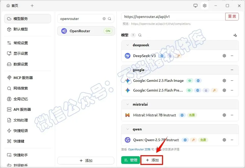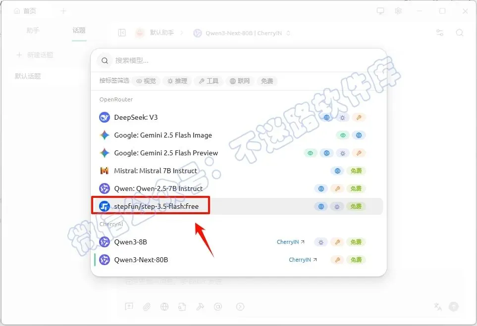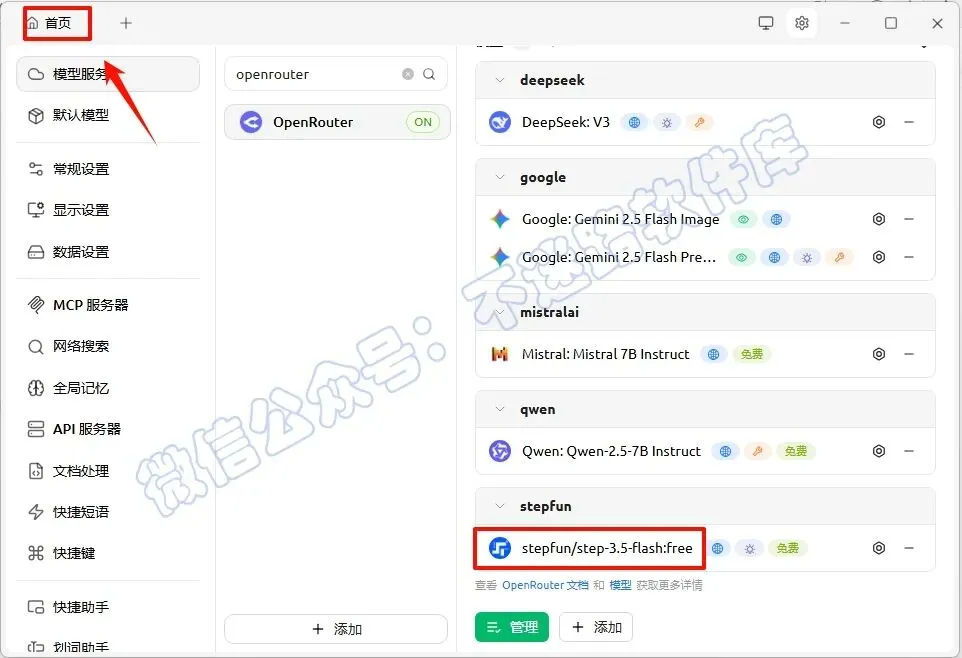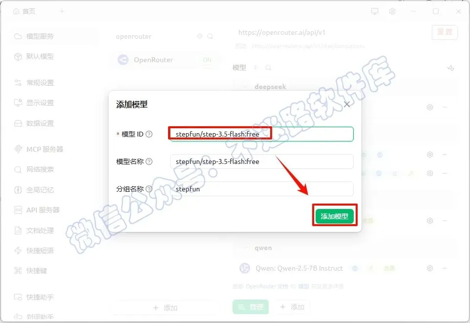 20.输入:stepfun/step-3.5-flash:free,点击”添加模型“
