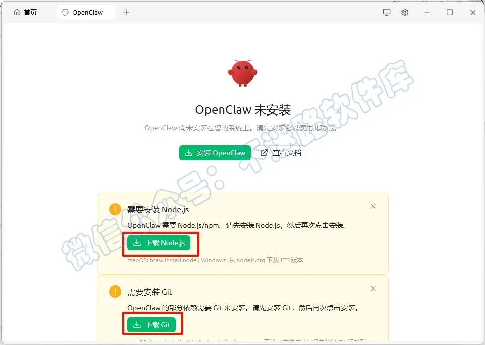 27.这里看到安装OpenClaw必须先安装“Node.js”和“Git”,安装包提供有下载好的“Node.js”和“Git”安装程序,当然你也可以在图中点击下载最新版,教程这里直接使用提供的安装包