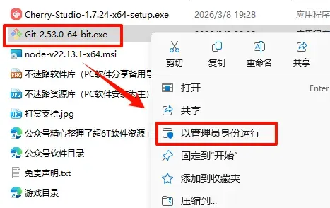 39.返回解压的“Openclaw”安装包,鼠标右键点击“Git-2.53.0-64-bit.exe”选择“以管理员身份运行”(Git下载地址:https://git-scm.com/install/windows)