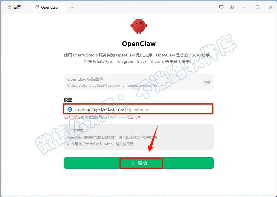 58.选择“stepFu/step-3.5-flash:free”模型,点击“启动”