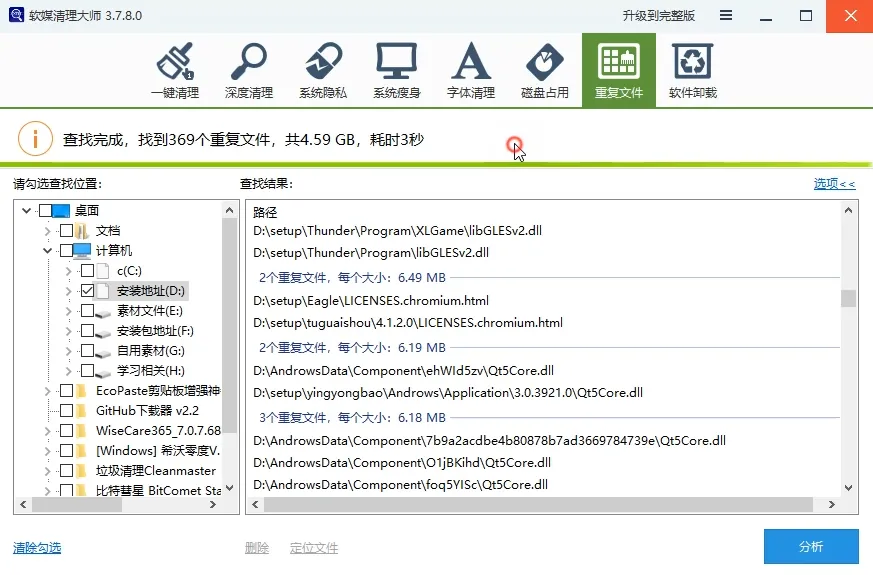 建议先“预览”扫描结果,确认无重要文件后再清理(尤其是重复文件里的“相似但不同版本”文档); - 系统盘谨慎