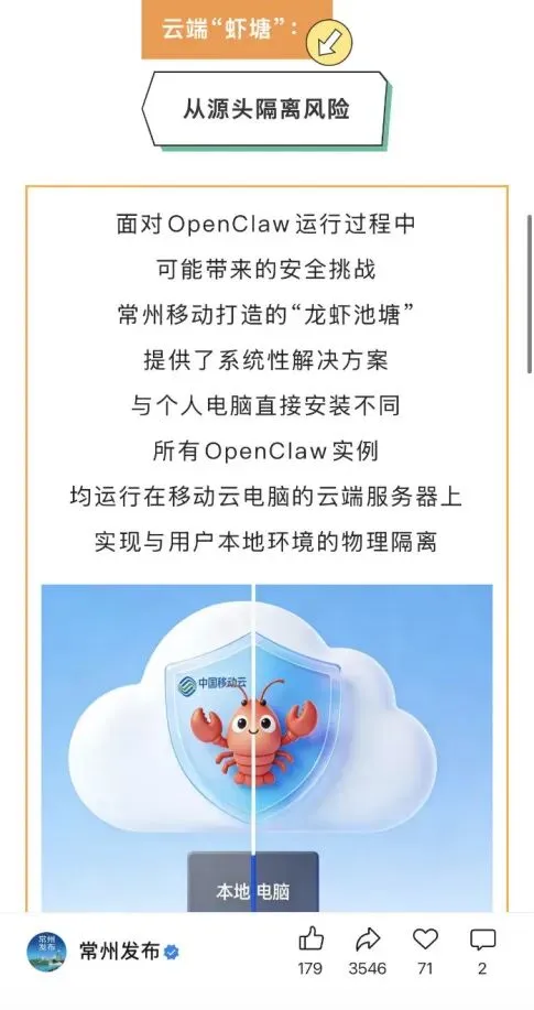 就在民间“养虾”乱象丛生时,江苏多地官方的举措显得格外清醒。南京、无锡、常州等地先后推出“免费送龙虾”政策:常州提供免费安装与使用时长,无锡发布“养龙虾 12 条”,最高给予500万元产业补贴,同时强调“云端安全部署”“最小权限原则”,从源头规避数据风险。