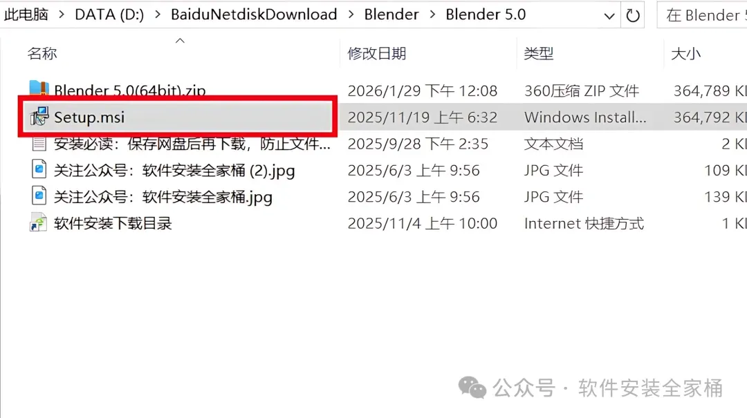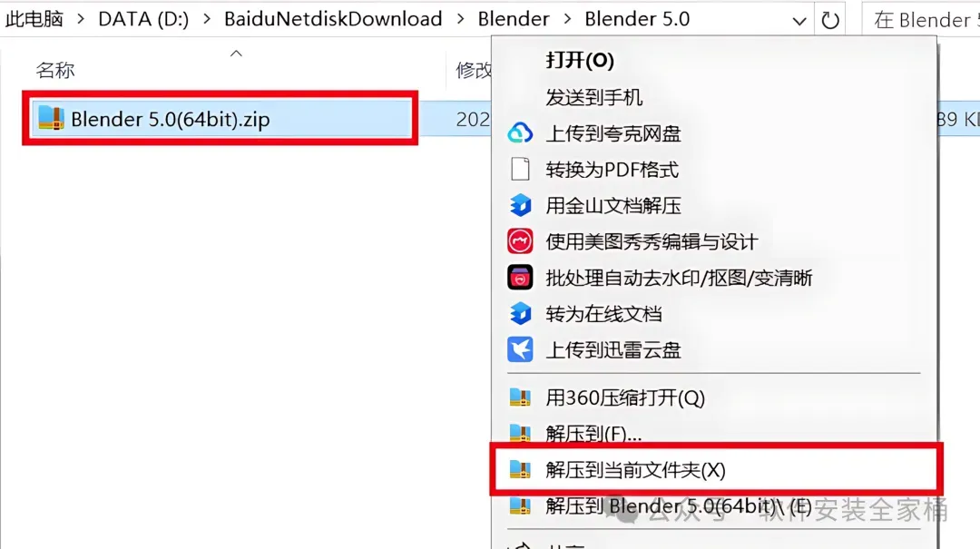 1.下载Blender 5.0软件安装包到电脑上,右键选择【解压到当前文件夹】。