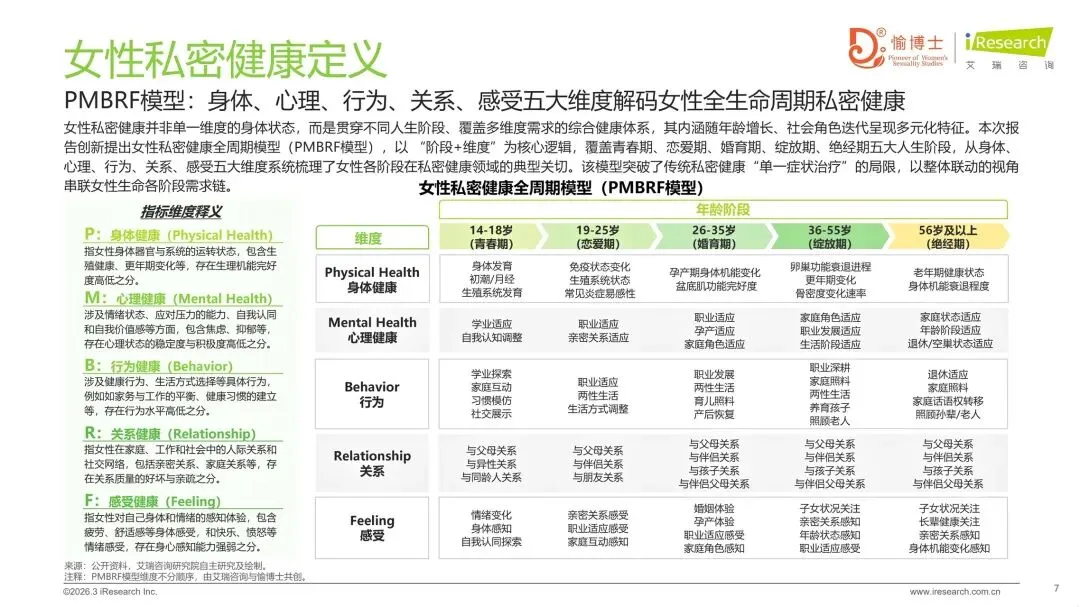 >新定义:报告基于2025年“五位一体”健康管理的理论基础,升级迭代女性私密健康全周期模型(PMBRF模型),从不同人生阶段的身体、心理、行为、关系、感受五大维度解码女性全生命周期私密健康。