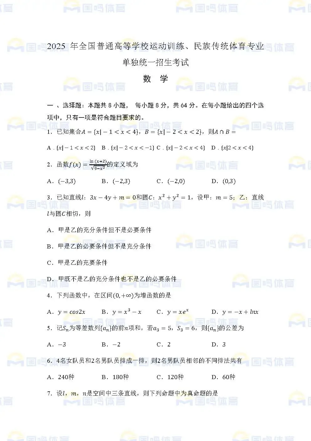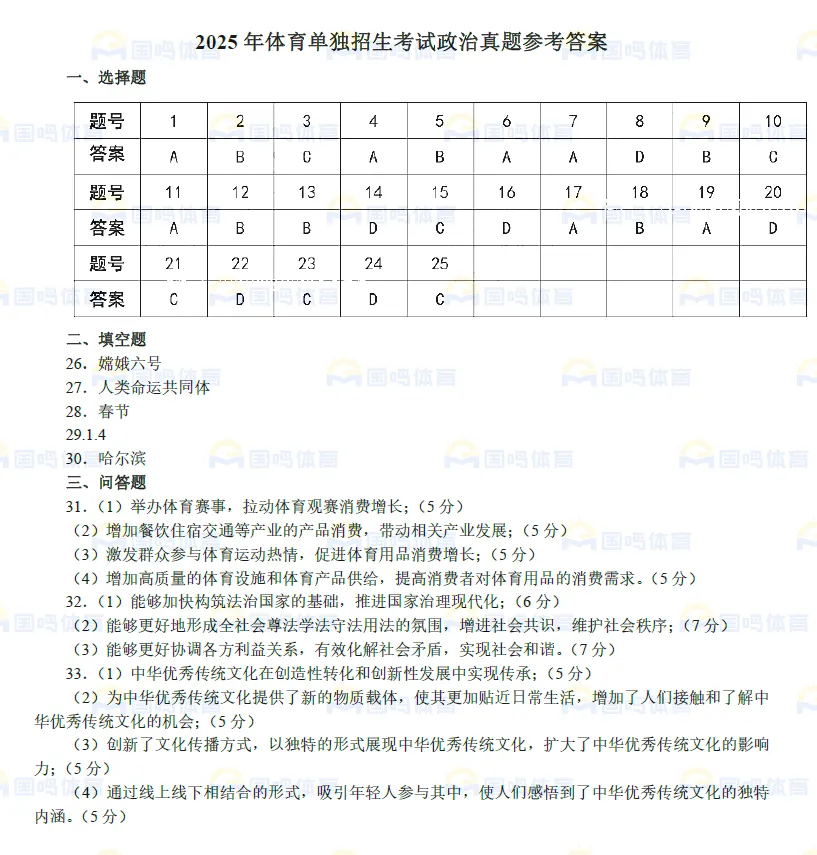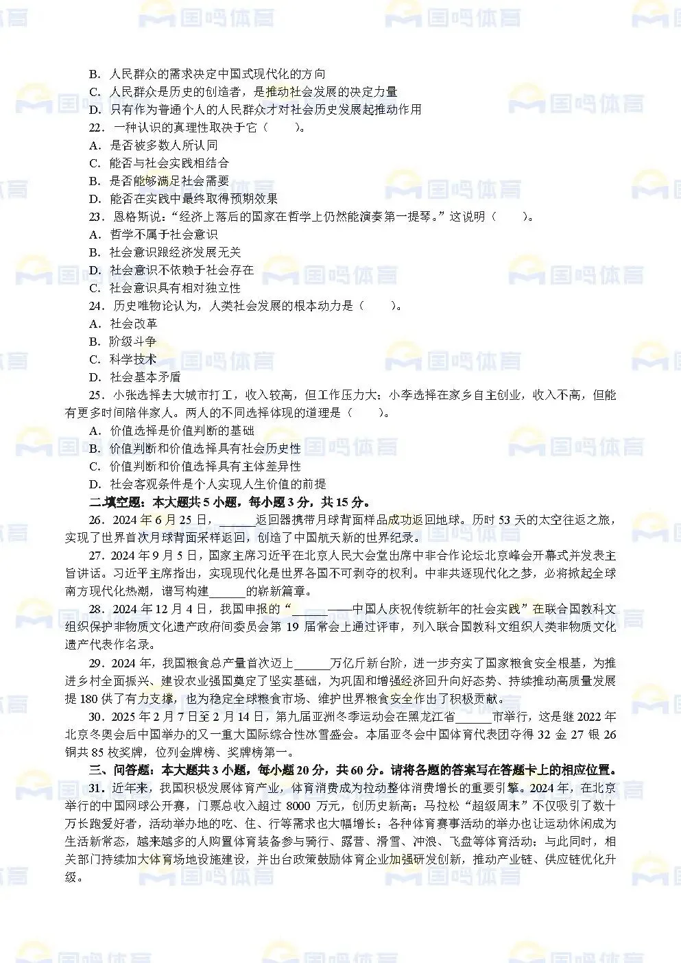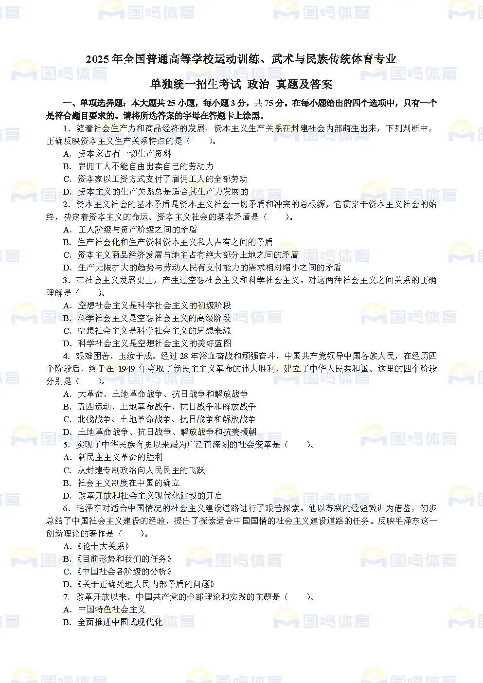 单招真题可下载!体育单招2025届数学、政治真题卷