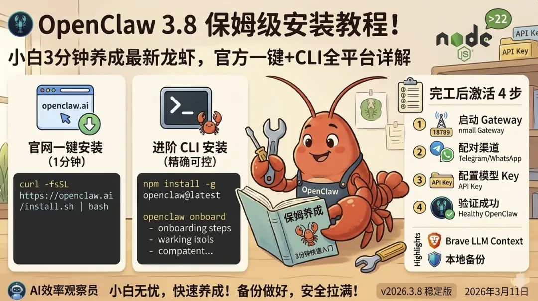 OpenClaw 3.8 保姆级安装教程!小白3分钟养成最新龙虾,官方一键+CLI全平台详解大家好,我是你们的AI效率观察员。前两天刚给你们拆完《OpenClaw 3.8 正式发布!本地备份+ACP溯源+Brave LLM Context全解决》,今天就直接上干货——官方最新 v2026.3.8 安装步骤!不管你是 macOS、Windows(WSL2)、Linux,还是第一次养虾的小白,这篇基于 openclaw.ai 官网 + GitHub 官方 Release + docs.openclaw.ai 的最完整保姆教程,保证你3-5分钟就能把最新版龙虾装好、跑起来。(PS:3.8 刚上线已经自动指向它,升级即安装!)一、前置条件(必看,避坑)
