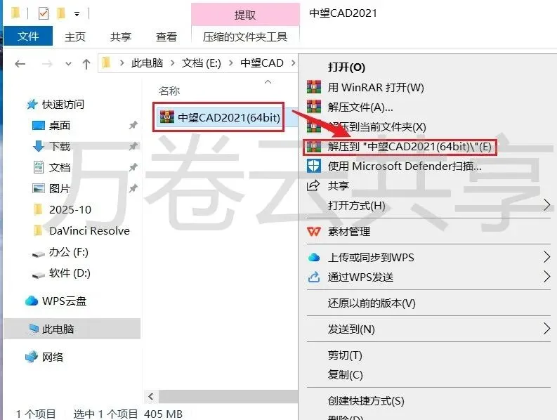 1.鼠标右击→压缩包,选择→解压到中望CAD2021(64bit)