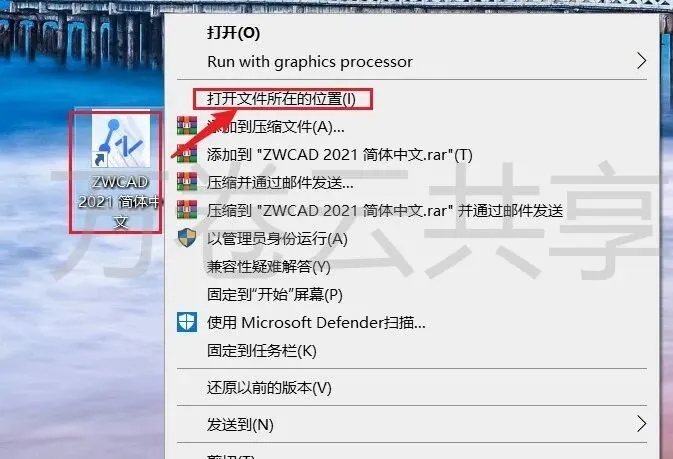 9.鼠标右击→桌面ZWCAD2021。选择→打开文件所在的位置
