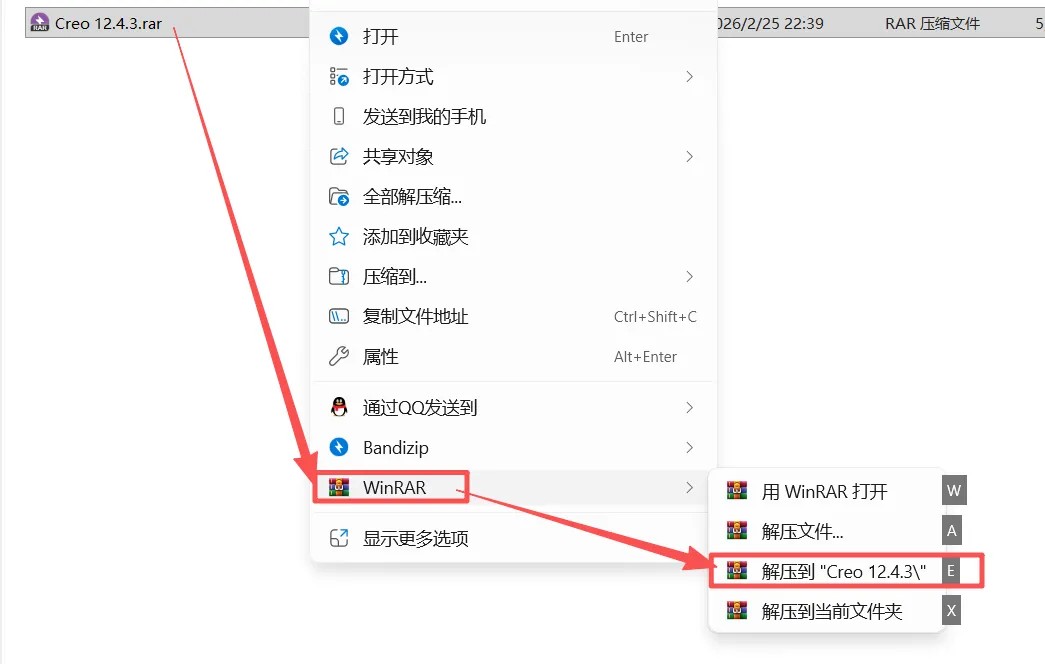 1.鼠标右击【Creo 12.4.3】压缩包,【解压到 Creo 12.4.3】文件夹。