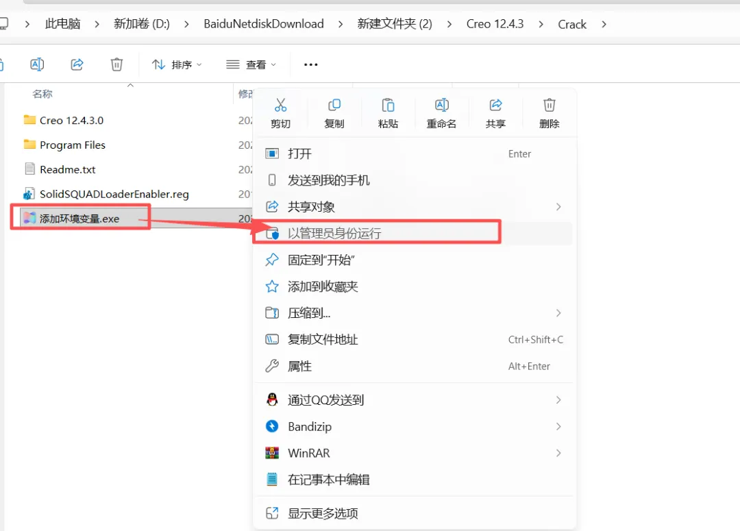 6.返回【Crack】文件夹内,以管理员身份运行【添加环境变量】(会出现黑框一闪而过)。