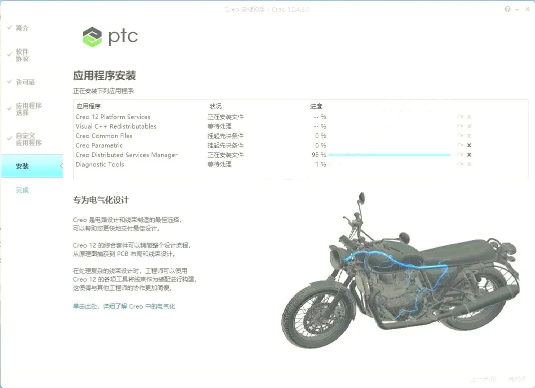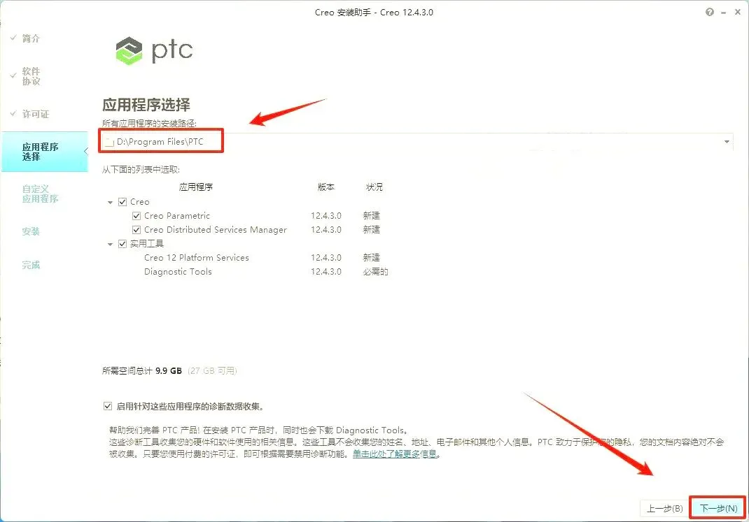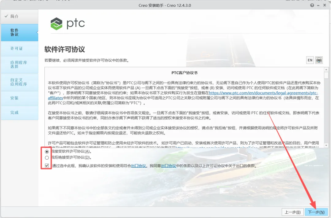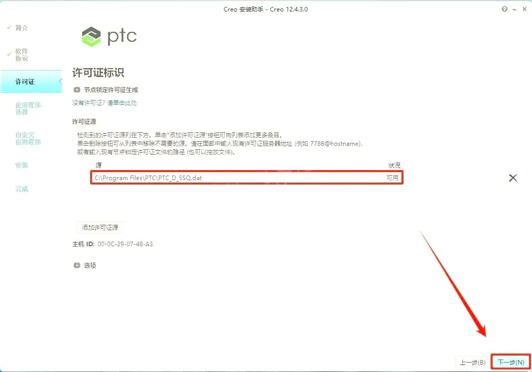 11.软件会自动识别许可证(如果没有识别,将之前(第4步)生成的“PTC_D_SSQ.dat”文件拖动到许可证位置),状况处显示【可用】即可,直接点【下一步】。(温馨提示:”PTC_D_SSQ.dat”文件路径为【C:\Program Files\PTC】。)