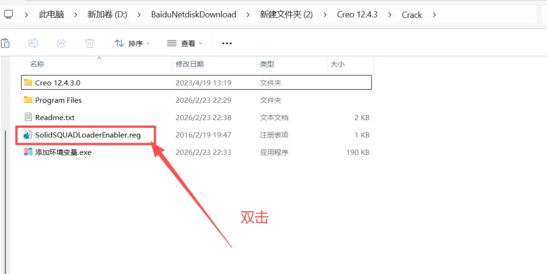 20.重新进入【Creo 12.4.3\Crack】文件夹内,双击【SolidSQUADLoaderEnabler】。