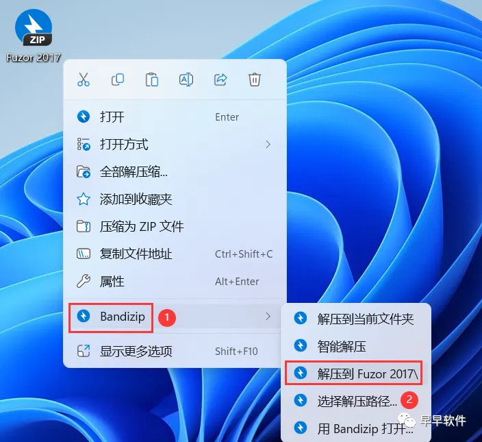 1、下载Fuzor 2017软件安装包到电脑上,右键选择【解压到Fuzor 2017\】