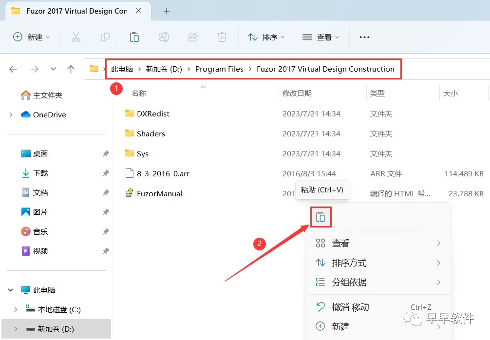 11、打开路径:D:\Program Files\ Fuzor 2017 Virtual Design Construction,再右键文件夹的空白处,点击【粘贴按钮】