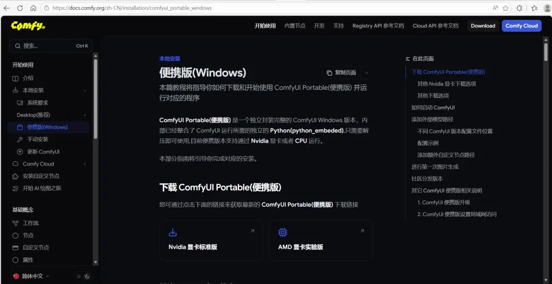 访问 comfyUI官网,进行软件下载,我这里下载的是ComfyUI Portable(便携版)下面的Nvidia显卡标准版。