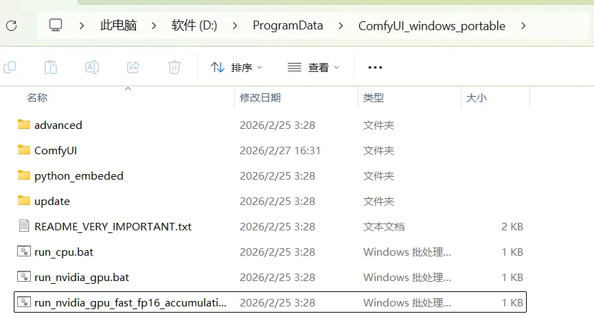 解压后进入 ConfyUI_windows_portable目录中,其中run_cpu.bat、run_nvidia_gpu.bat、run_nvidia_gpu_fast_fp16_accumulation.bat是三个启动文件,携带nvidia的bat对显卡有要求,最少是英伟达30代以上,我采用cpu进行启动,所以双击run_cpu.bat进行启动。