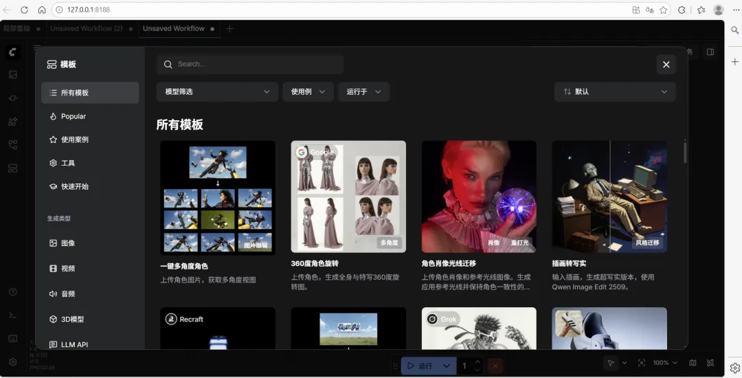 启动完成后会自动打开网页,则可看到comfyUI的操作页面。