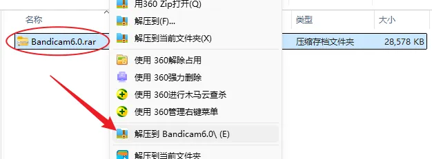 1.解压安装包:鼠标右击【Bandicam6.0】压缩包,选择电脑上安装的解压软件,点击【解压到 Bandicam6.0】。