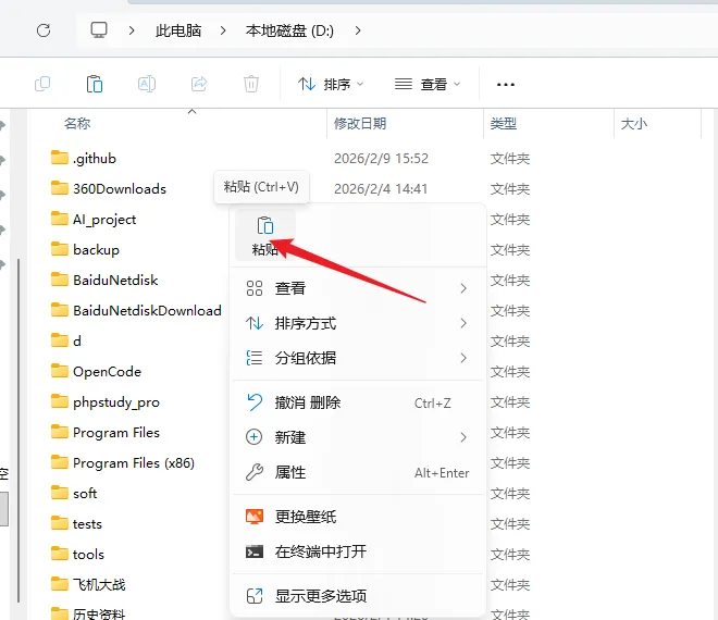 3.打开需要将软件安装的磁盘位置(如:D盘),鼠标右击空白处选择【粘贴】。