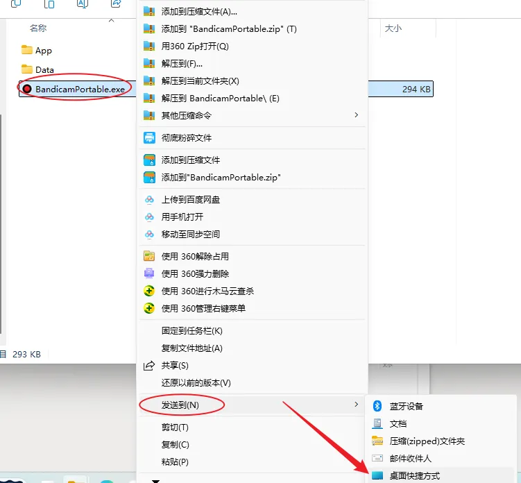 4.双击打开粘贴后的【Bandicam6.0】文件夹,鼠标右击【Bandicam……】选择【发送到】-【桌面快捷方式】。
