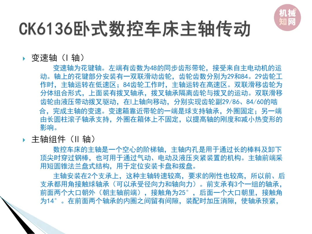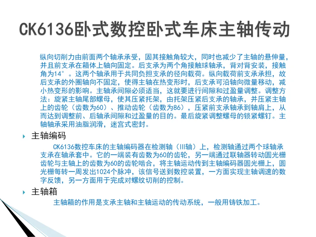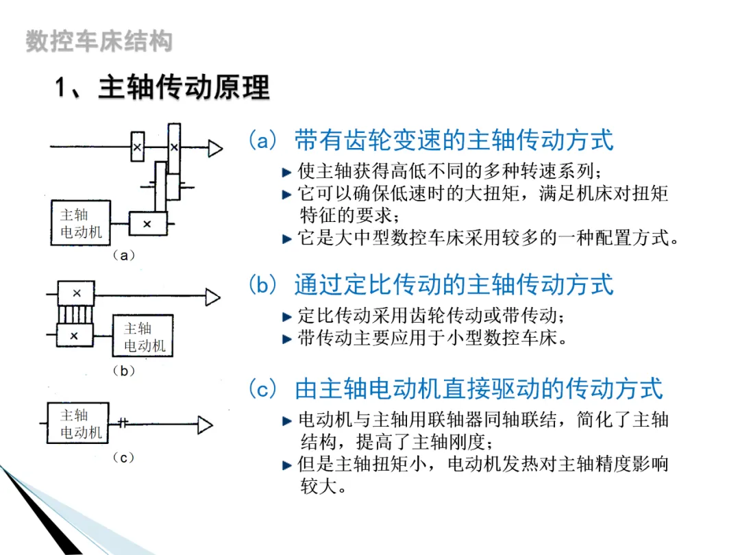 4. 主轴传动原理:数控车床的主轴传动形式主要有电动机直接传动、齿轮传动、带传动、电主轴传动四种形式。电动机直接传动结构简单,但主轴转速的变化及转矩的输出和电动机的输出特性一致;齿轮传动通过变速齿轮变速降速,增大输出转矩;带传动可以免齿轮传动引起的振动和噪声,但主轴调速范围受电动机调速范围的约束;电主轴传动结构紧凑、重量轻、惯量小,但制造和维护困难,且成本较高。