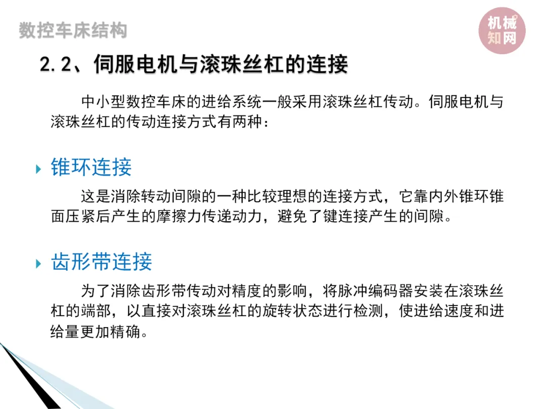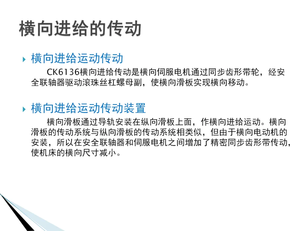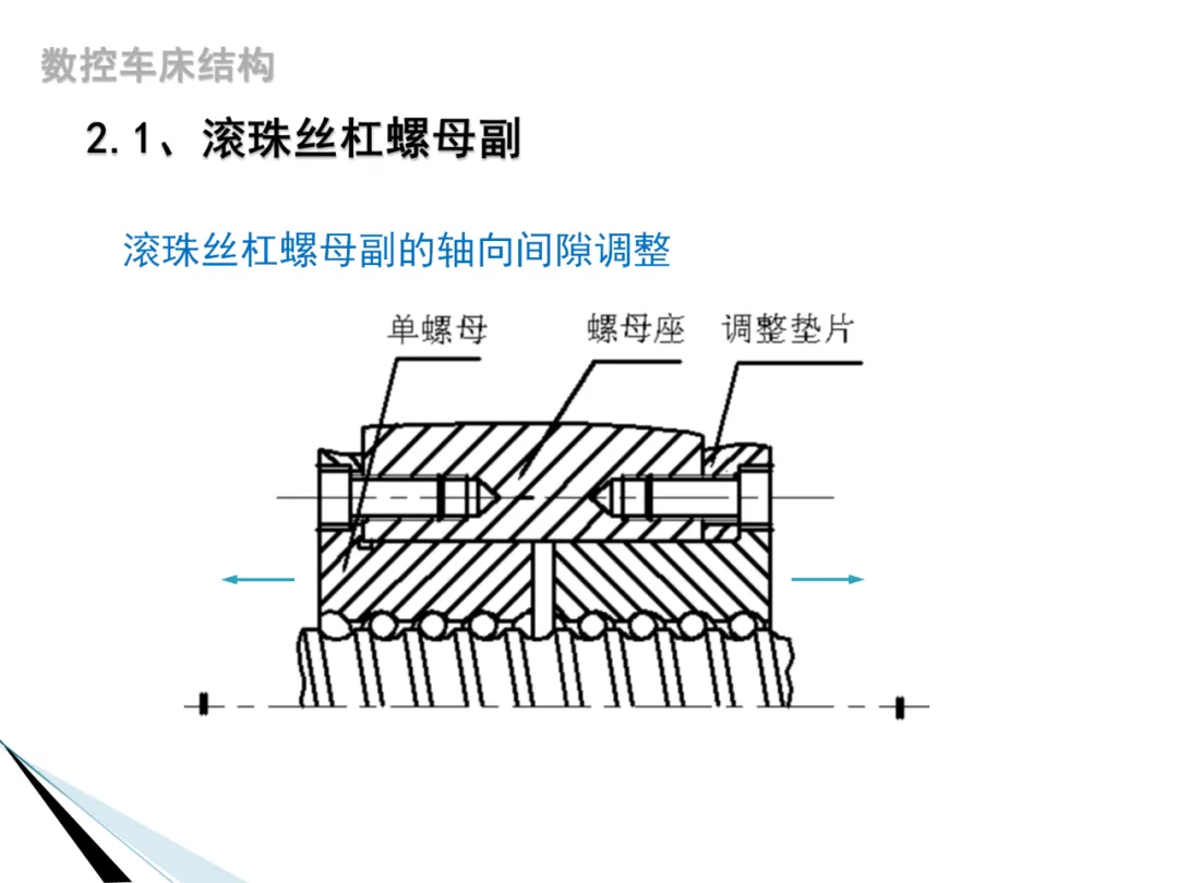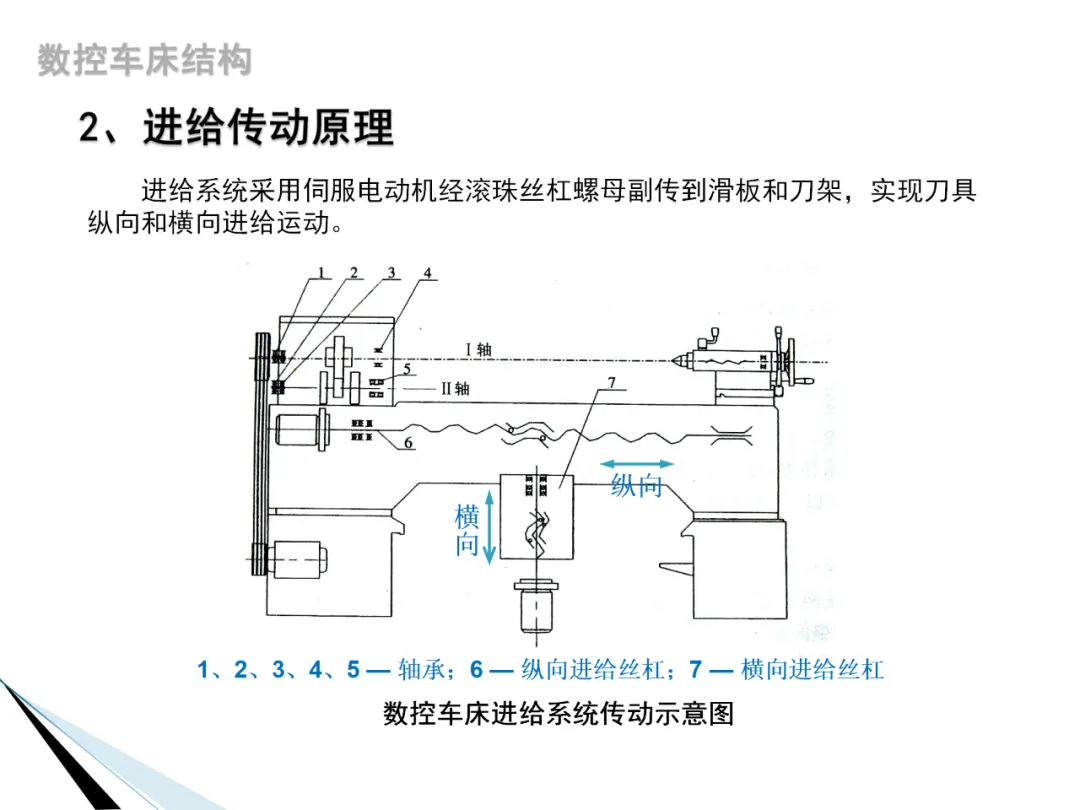 5. 进给传动原理:进给系统采用伺服电动机经滚珠丝杠螺母副传到滑板和刀架,实现刀具纵向和横向进给运动。滚珠丝杠螺母副的轴向间隙调整是保证进给精度的重要环节。
