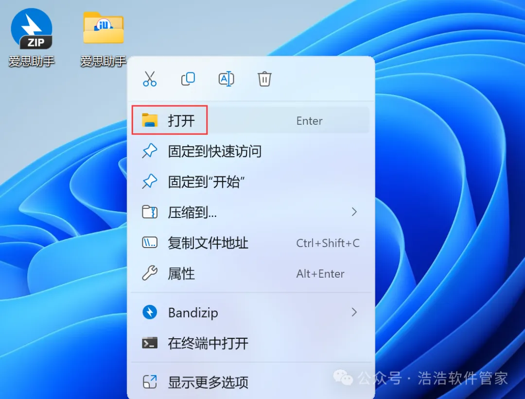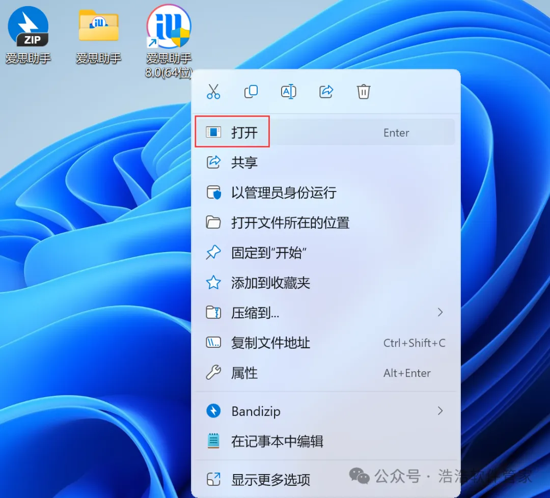 8、回到桌面,右键桌面上的【爱思助手软件图标】,点击【打开】