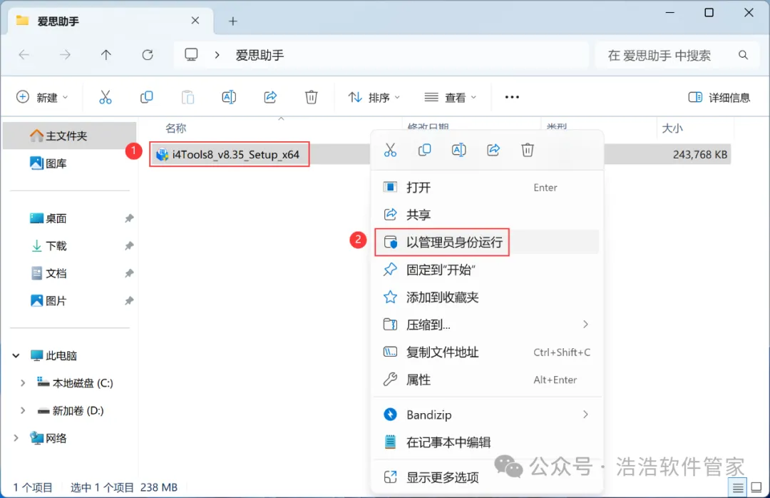 3、找到【爱思助手】应用程序,右键选择【以管理员身份运行】它