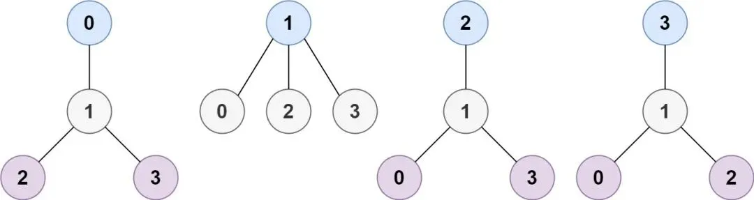可选择树中任何一个节点作为根。当选择节点 作为根节点时,设结果树的高度为 。在所有可能的树中,具有最小高度的树(即,min(h))被称为 最小高度树 。