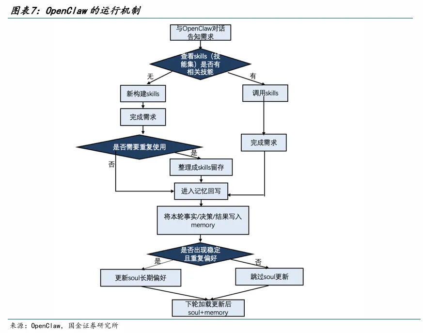 系统围绕“能力匹配—执行—沉淀—优化”的闭环展开。任务触发后优先匹配既有Skills,不存在则构建新逻辑完成执行,并将具备复用价值的部分沉淀为标准化Skills,同时把关键事实与结果写入Memory。仅在形成稳定行为模式时才更新Soul等核心规则,避免策略频繁波动。