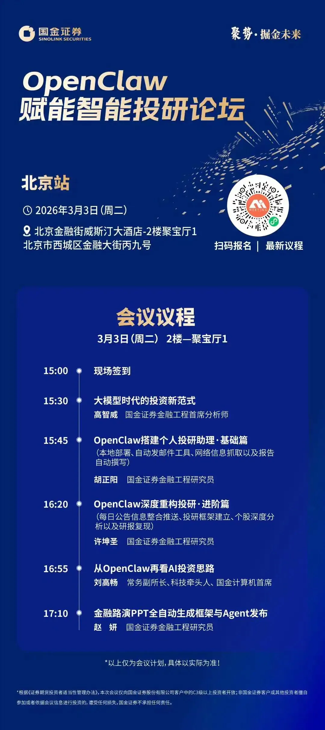 2月26日,国金OpenClaw赋能投研论坛【上海站】圆满收官,吸引数百位投资者齐聚现场,【北京站】将于3月3日(周二)正式启程,欢迎广大投资者莅临现场,共同探讨OpenClaw时代的投资新思路!