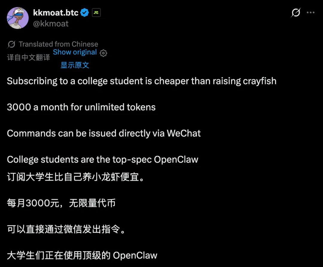 龙虾需要大量token,而实习生只需要一个月3K工资,此为一胜;