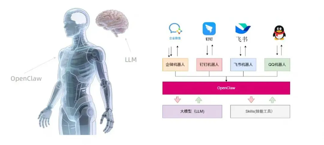 OpenClaw如同一个“人形框架”,大模型是它的“大脑”,通过大模型理解指令意图并执行动作。