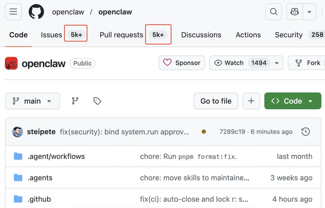 目前OpenClaw在GitHub(全球最大的开发者社区) 上的 Issues(问题反馈)和Pull Requests(代码修改请求)数量都已经爆表,双双超过了显示上限的5000+。