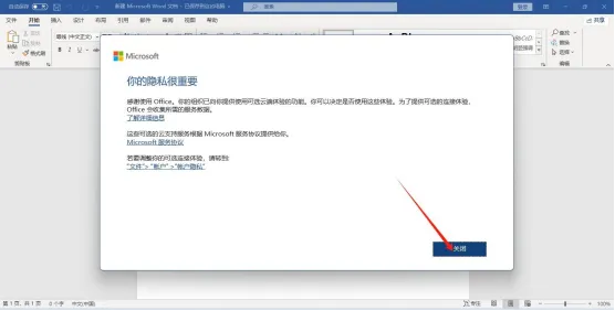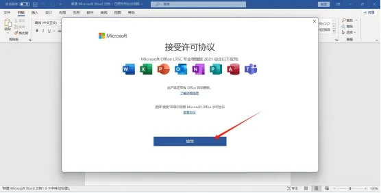 12.安装好默认是没有图标在桌面,可以通过右键-新建方式创建,小编创建一个word文档然后打开,点击接受!
