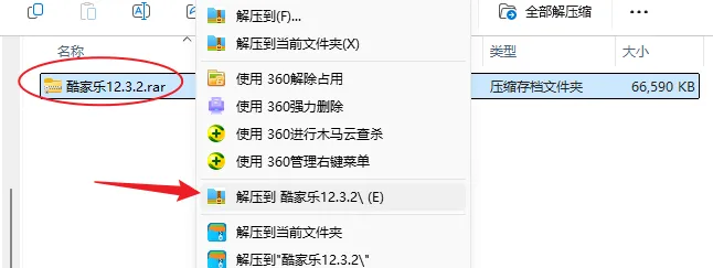 1.解压安装包:鼠标右击【酷家乐12.3.2】压缩包,选择电脑上安装的解压软件,点击【解压到 酷家乐12.3.2】。