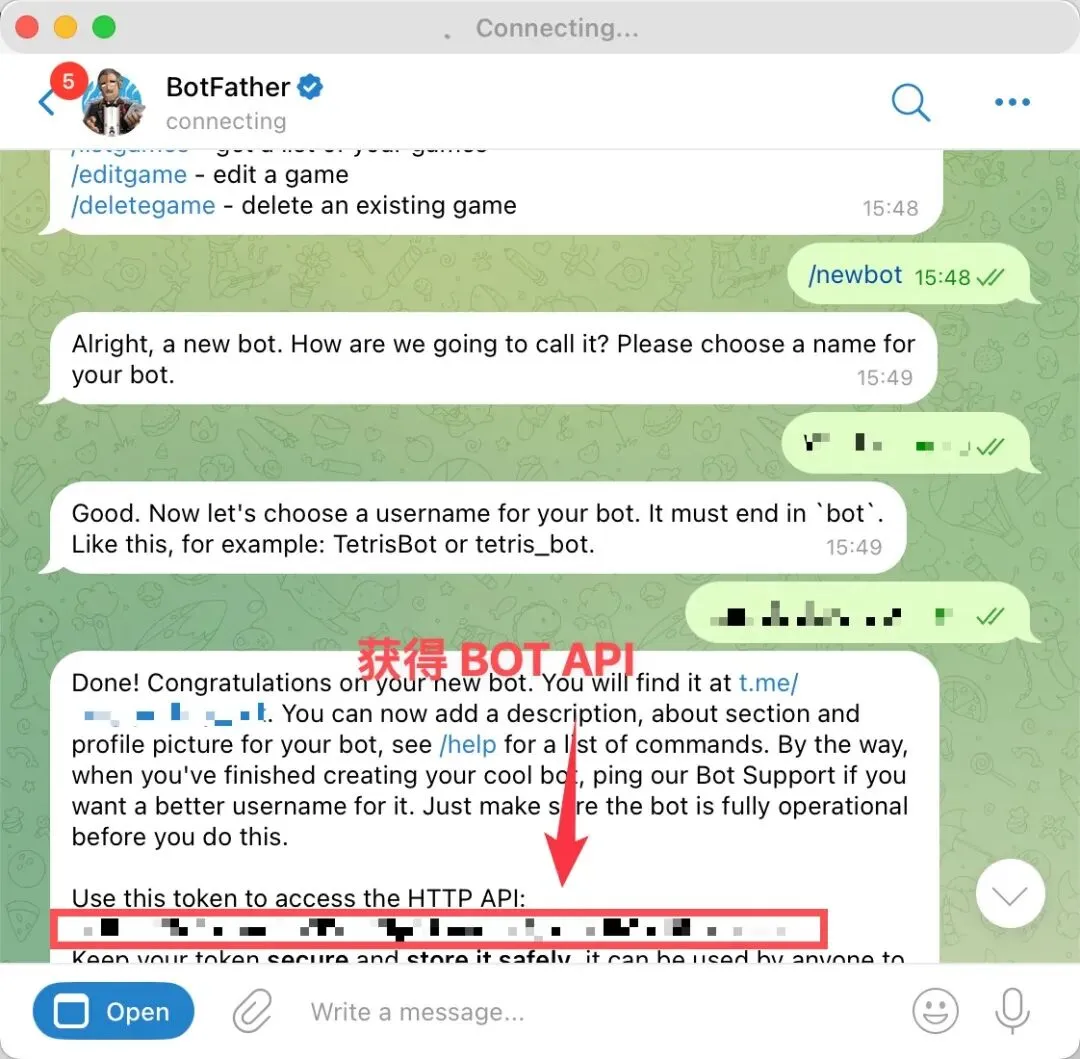 在 Telegram 上找 @BotFather 聊天,输入 /newbot,然后设置好昵称和帐号名,最终记录下 Bot 的 API Key。