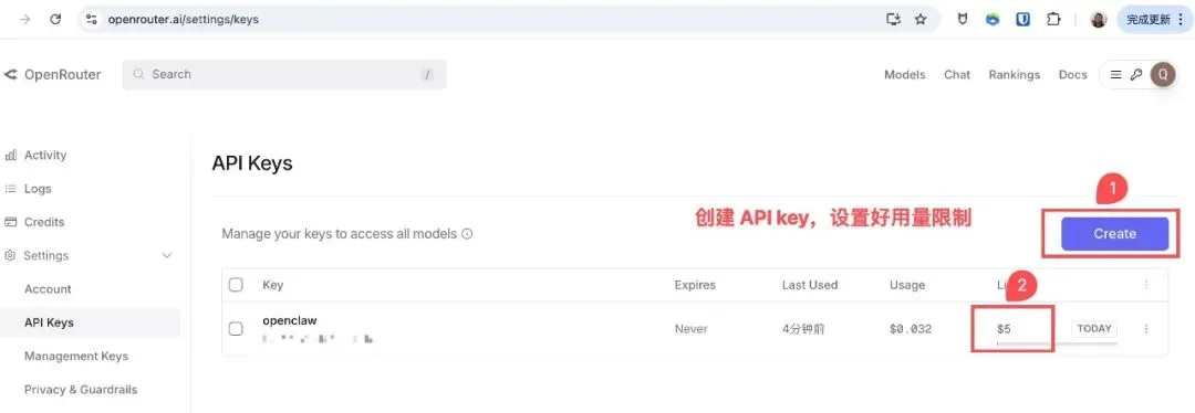 我申请的是 OpenRouter 上的 Key,这样方便切换模型做测试。这一步需要刷信用卡充值。